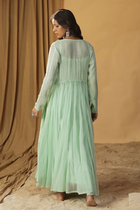Buy_Arpita Sulakshana_Green Chanderi, Georgette Embroidery, Beads, Stones Floral Kurta With Jacket _Online_at_Aza_Fashions
