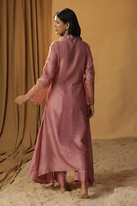 Pink Chanderi A-line kurta featuring abstract hand paint motifs, pearls, and cutdana embroidery. Paired with coordinating solid straight pant with scallop hem sleeves.
