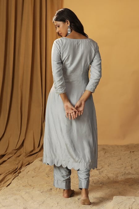 Ice blue kurta featuring scalloped hem, foil hand paint, and floral cutdana embroidery. Paired with solid straight pant and coordinating dupatta.
