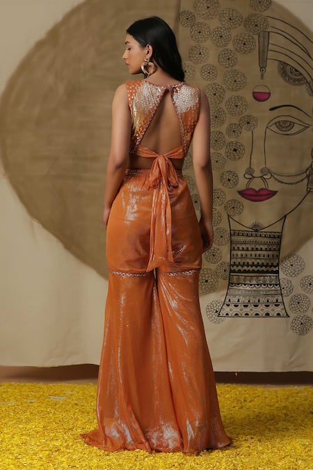 Buy_Arpita Sulakshana_Orange Georgette, Crepe Sequins V-neck Hand Embroidered Palazzo Set With Cape _at_Aza_Fashions