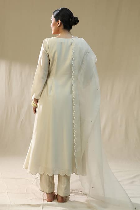 Ivory A-line kurta featuring dori zardozi sitara resham work and a scalloped hem. Paired with matching pants and an organza dupatta adorned with tassels.