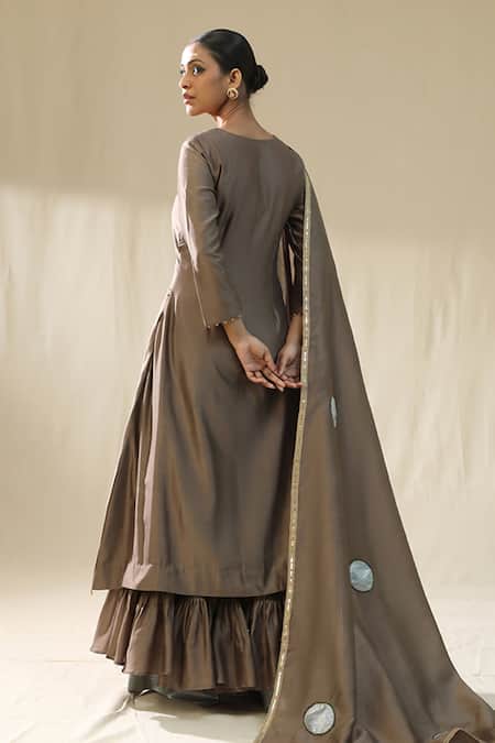 Mocha brown suit set featuring a kurta with gotta patti and dabka embroidery. Includes a gharara and dupatta for a complete look.