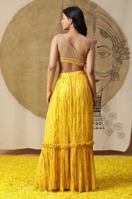 Yellow embroidered blouse featuring one shoulder design with sequins, beads, and dori work. Paired with a matching palazzo and an ombre cape with placed dori embroidery.