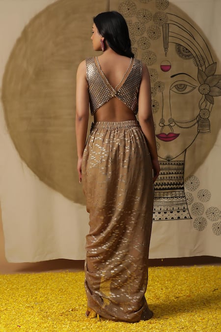 Brown Georgette, Crepe Sequins, Crystals V-neck Textured Blouse Dhoti Pant Set