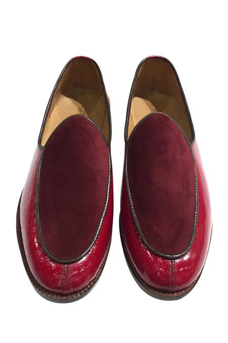 Crimson red toned shoes with textures on one side and plain leather on the other with velvet fabric on the upper side.