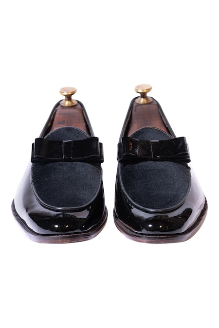 Black loafers with velvet panel, bow detail, almond apron-toe & stack heels.
