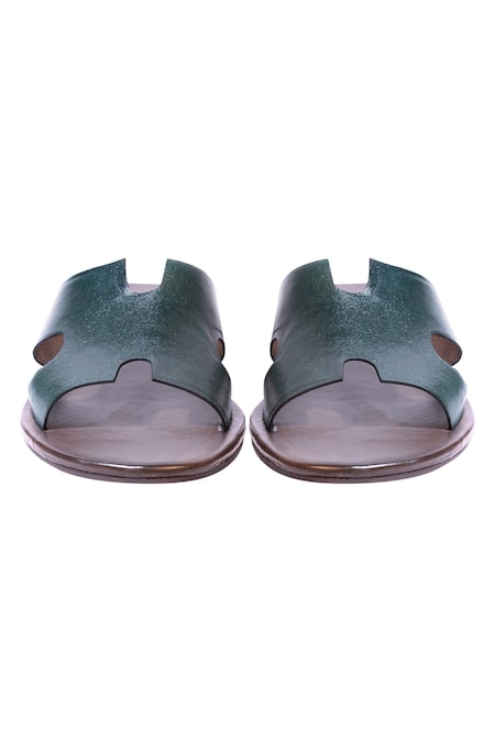 Green handcrafted sandals with single broad cutout straps, stack heels & cushioned sole.