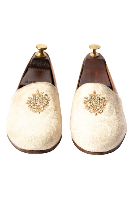 Burnt tan & off-white espadrilles with stack heels, almond toe & placement thread work.