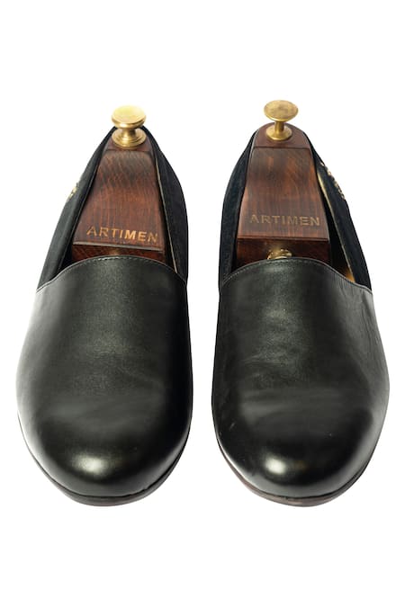 Black half-and-half style espadrilles with almond-toe, stack heels & placement embroidered motifs.