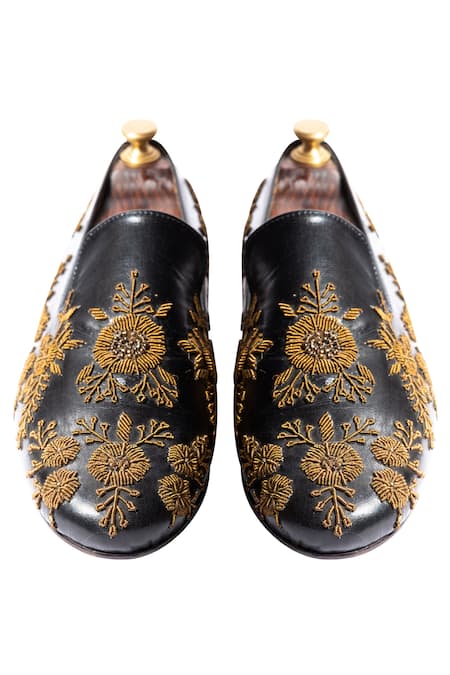 Black Leather Handcrafted Embroidered Loafers