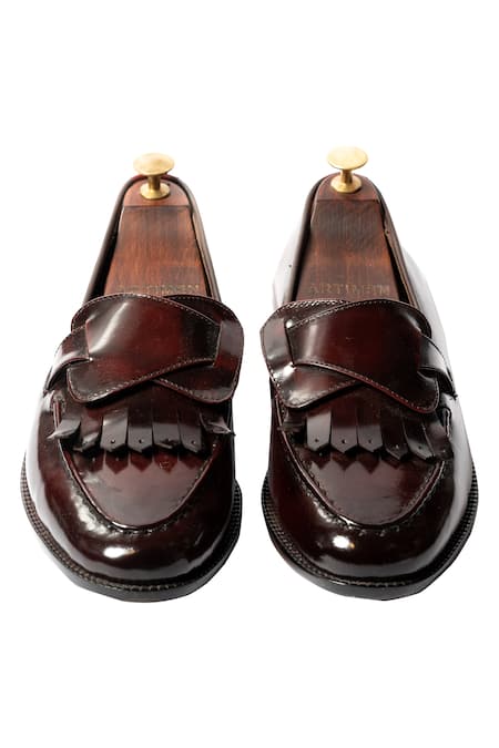Burnt cherry loafers with stack heels & cutwork kiltie detail.