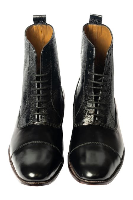 Black dual-tone leather mid-top boots with cap-toe, textured panel & stack heels.