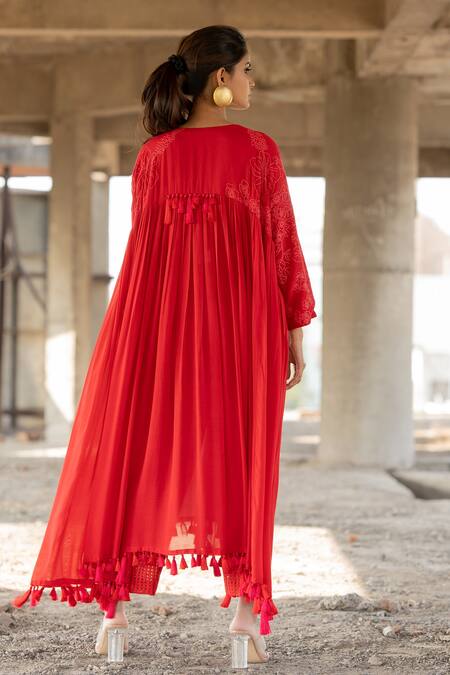Red flared anarkali featuring tonal floral thread embroidery and gathered details from the yoke. Paired with matching self chanderi pants with a fringed tassel hem.