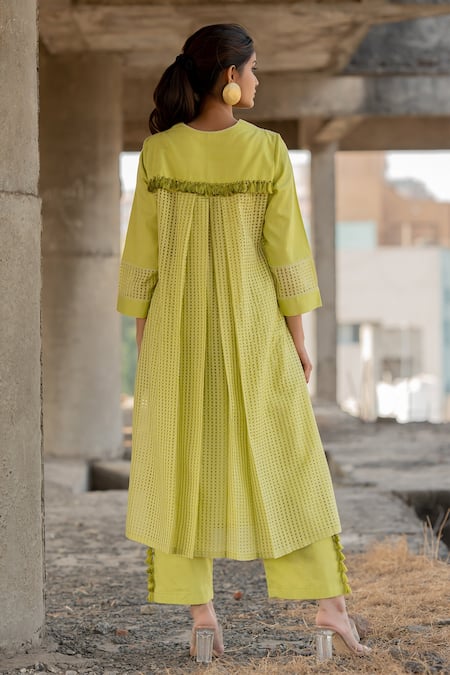 Green kurta featuring floral thread embroidery with checkered plated back. Paired with matching tasselled pant.