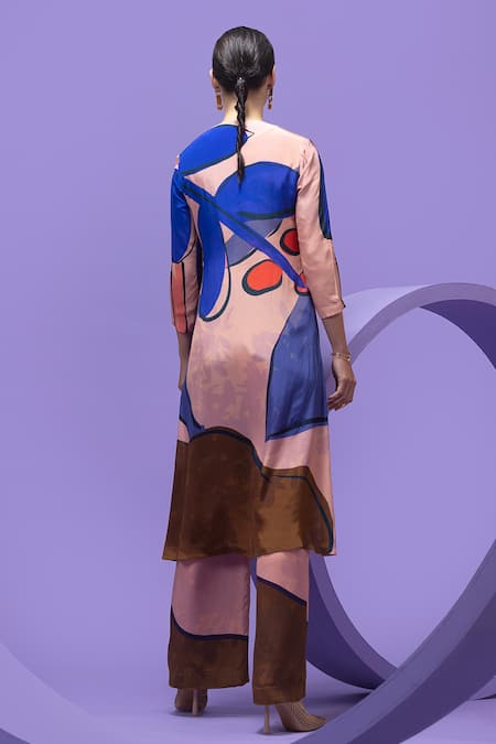 Multi-colored kurta featuring an artistic abstract print with high slits, paired with matching pants. Crafted from natural crepe fabric, this set offers a relaxed fit and three-quarter sleeves.