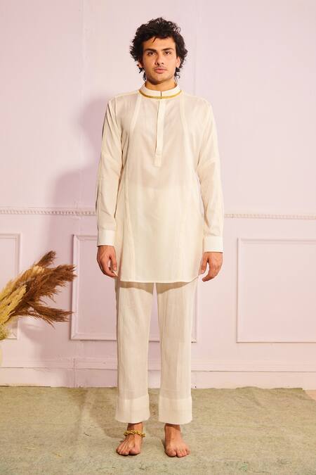 Ivory panelled short kurta with pintuck detail & mandarin collar.