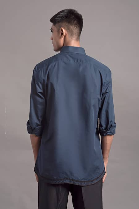 Blue shirt featuring geometric velvet applique work with rolled-up sleeves