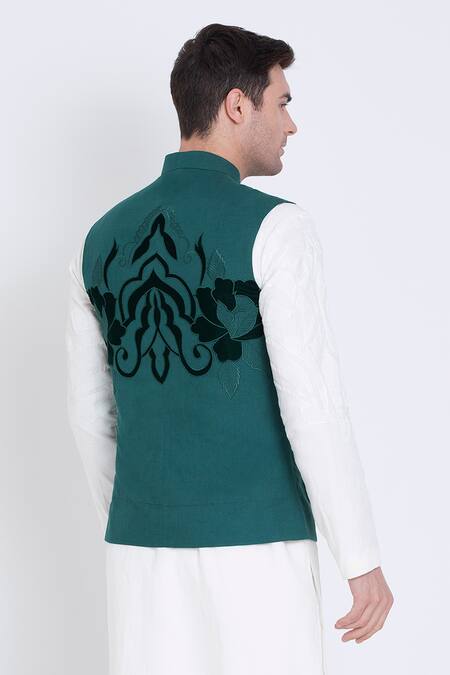 Teal green sleeveless bundi crafted from linen featuring contrasting black Damask bloom embroidery detailing