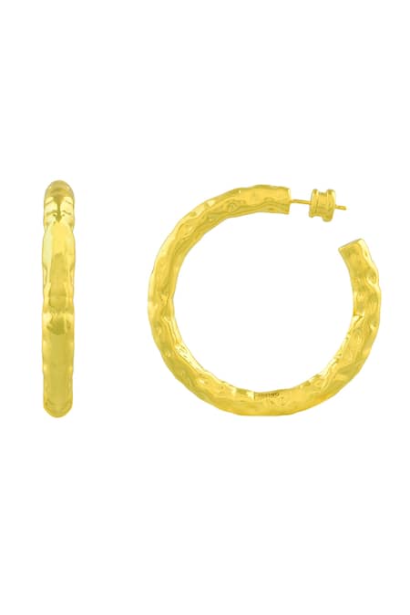 Gold large hoops featuring a raw, unfinished surface with intricate etching