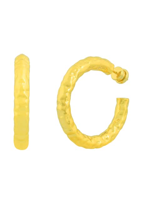 Gold medium hoops featuring a raw, unfinished surface with intricate etching