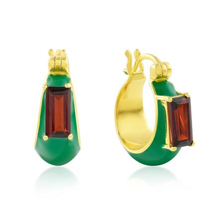Gold plated huggie earrings featuring green accents and garnet stone embellishments