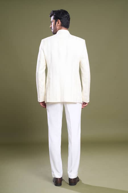 Cream bandhgala featuring full sleeves and aztec bloom embroidery. Paired with matching pants in a silk blend.
