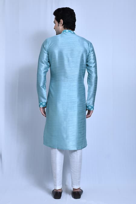 Buy_Arihant Rai Sinha_Blue Gingham Blossom Woven Band Collar Kurta With Pant _Online_at_Aza_Fashions