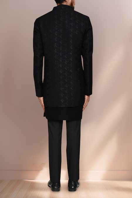Navy blue bandhgala featuring checkered woven motifs. Paired with a sleeveless longline jacket and pant.