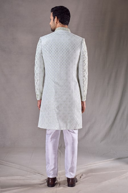 Pista green sherwani featuring all over diamond jaal embroidery and a stand collar. Paired with an off white pyjama made from silk dupion.