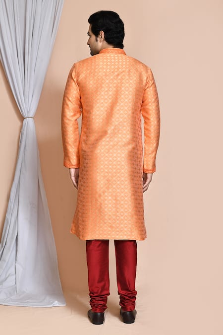 Orange kurta featuring diamond woven motifs, thread and sequin embroidery on the placket. Paired with a maroon churidar with an elasticated waistband.