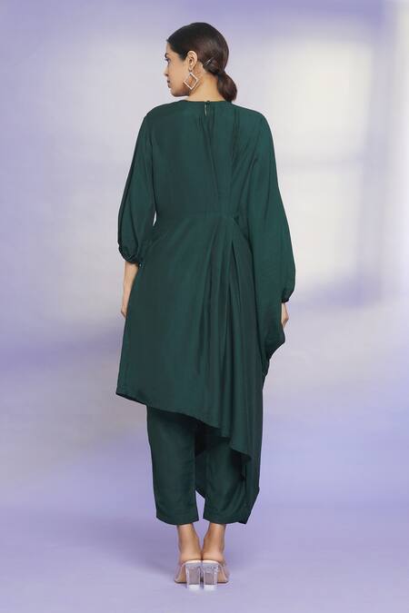 Green Polyester Blend Bead Work Round Draped Kurta And Pant Set