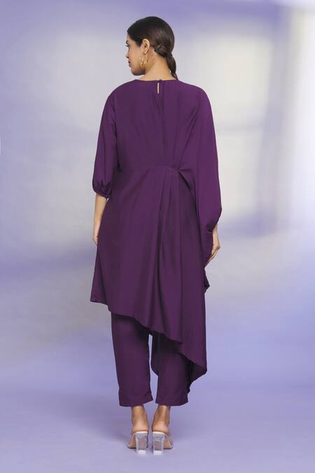 Purple polyester blend draped kurta with waist embellishments in bead work. Comes with straight fit pant.