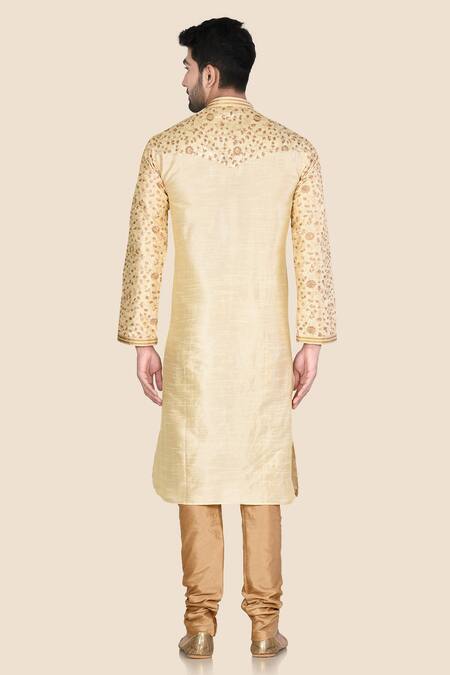 Beige kurta with all-over embroidery and front potli placket. Comes with brown churidar.
