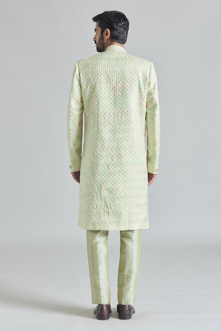 Green Silk, Viscose, Satin Flora Vine Embroidered Layered Sherwani With Pant