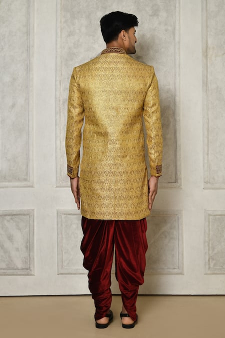 Gold sherwani featuring a floral brocade pattern with an embroidered collar and cuffs. Paired with a contrast velvet dhoti churidar.