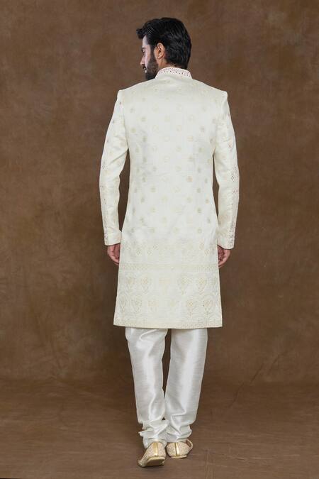 Off-white sherwani featuring sequin and bead hand work in floral butta pattern. Paired with a churidar and an embellished hem dupatta.