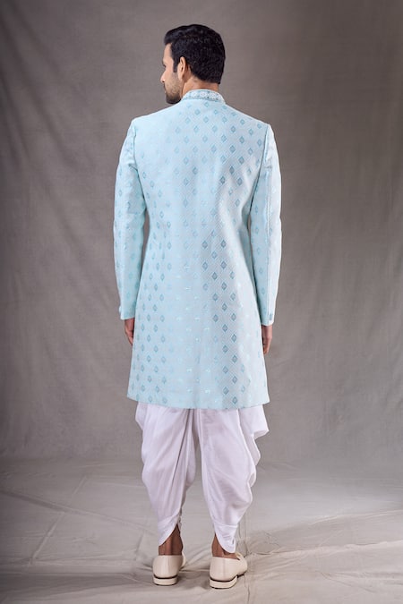 Mint green sherwani featuring a stand collar, front button closure, and full sleeves with an all-over zari floral butti jacquard pattern. Paired with an off-white dhoti pant made from art silk fabric.