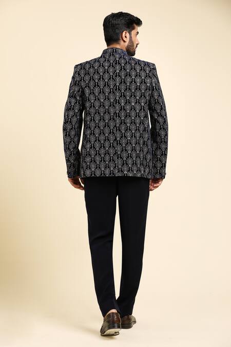 Blue bandhgala featuring floral bloom embroidery with cutdana and beads. Paired with a coordinating trouser for a complete look.