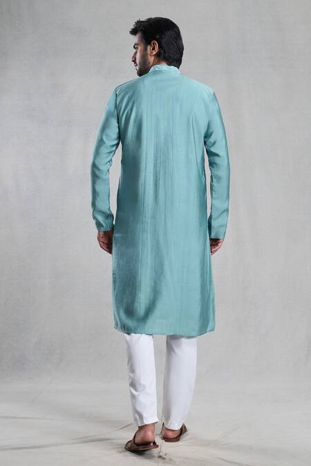 Mint kurta featuring a floral embroidered placket and stand collar. Paired with off-white pants for a complete look.