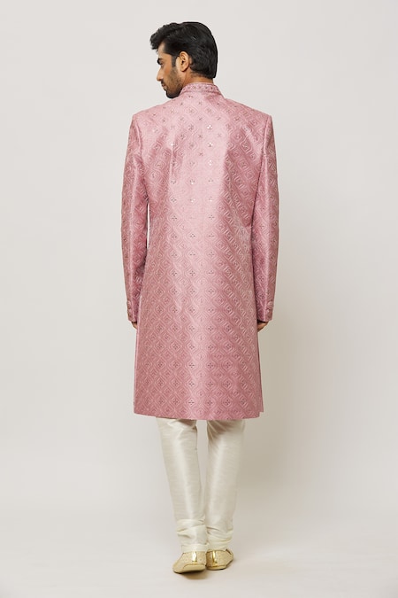 Pink sherwani featuring embroidered floral wave patterns embellished with crystals and sequins. Paired with a churidar crafted from dupion art silk.