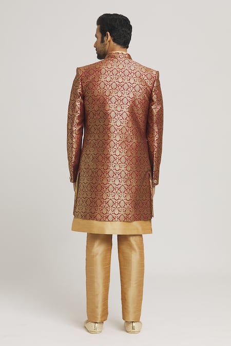 Contrasting floral woven patterns on the jacket, Front embroidered button closures on the sherwani, Mandarin neckline on the jacket