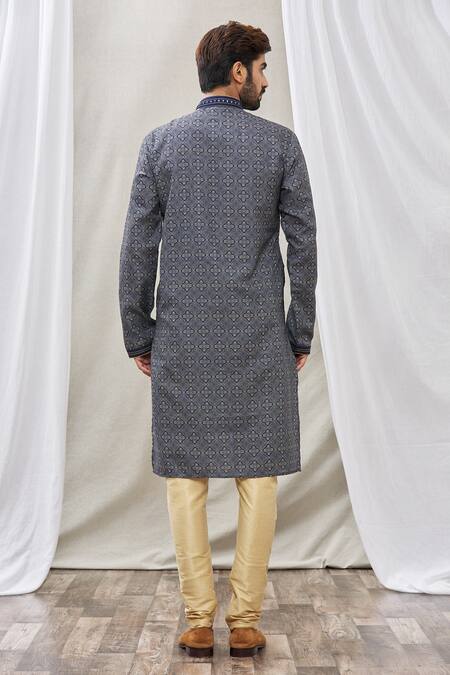 Blue Handloom Cotton Embroidery Floral Placket Kurta