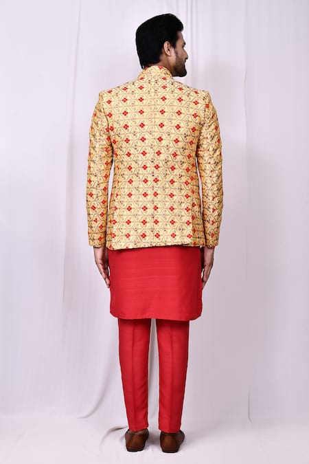 Golden jacket featuring all-over quatrefoil floral embroidery. Paired with a red kurta and pant pyjama.