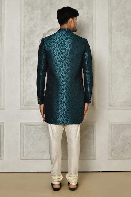 Buy_Arihant Rai Sinha_Blue Jacquard, Silk Brooches Floral Vine Pattern Sherwani With Churidar _Online_at_Aza_Fashions