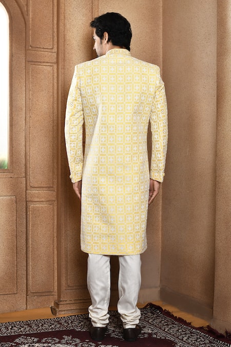 Buy_Arihant Rai Sinha_Yellow Silk, Chanderi Embroidery Flower Jaal Sherwani With Churidar
