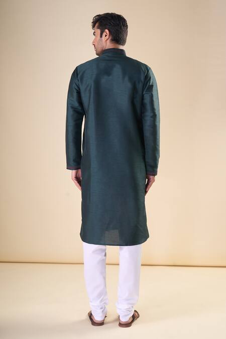 Bottle green solid straight kurta featuring a band collar and front placket