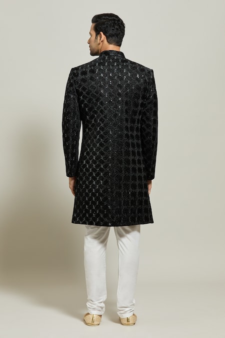 Black Velvet, Polyester Sequins, Geometric Pattern Sherwani And Churidar Set
