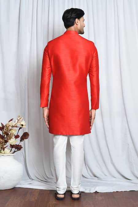 Red Silk, Polyester Geometric Placement Woven Sherwani Set