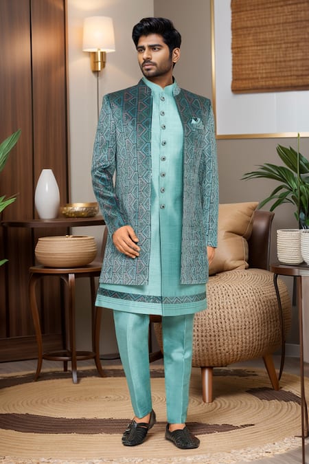 Blue Silk Sequins, Embroidery Geometric Sherwani Set