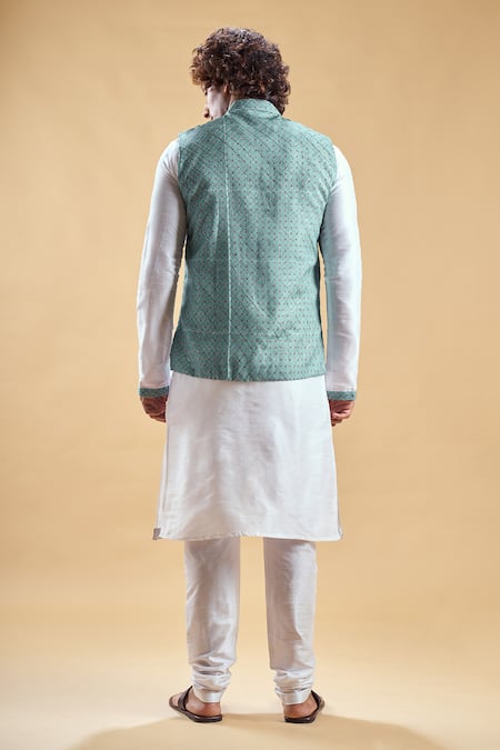 Firozi nehru jacket featuring thread embroidered geometric motifs. Paired with a solid off-white kurta and churidar.